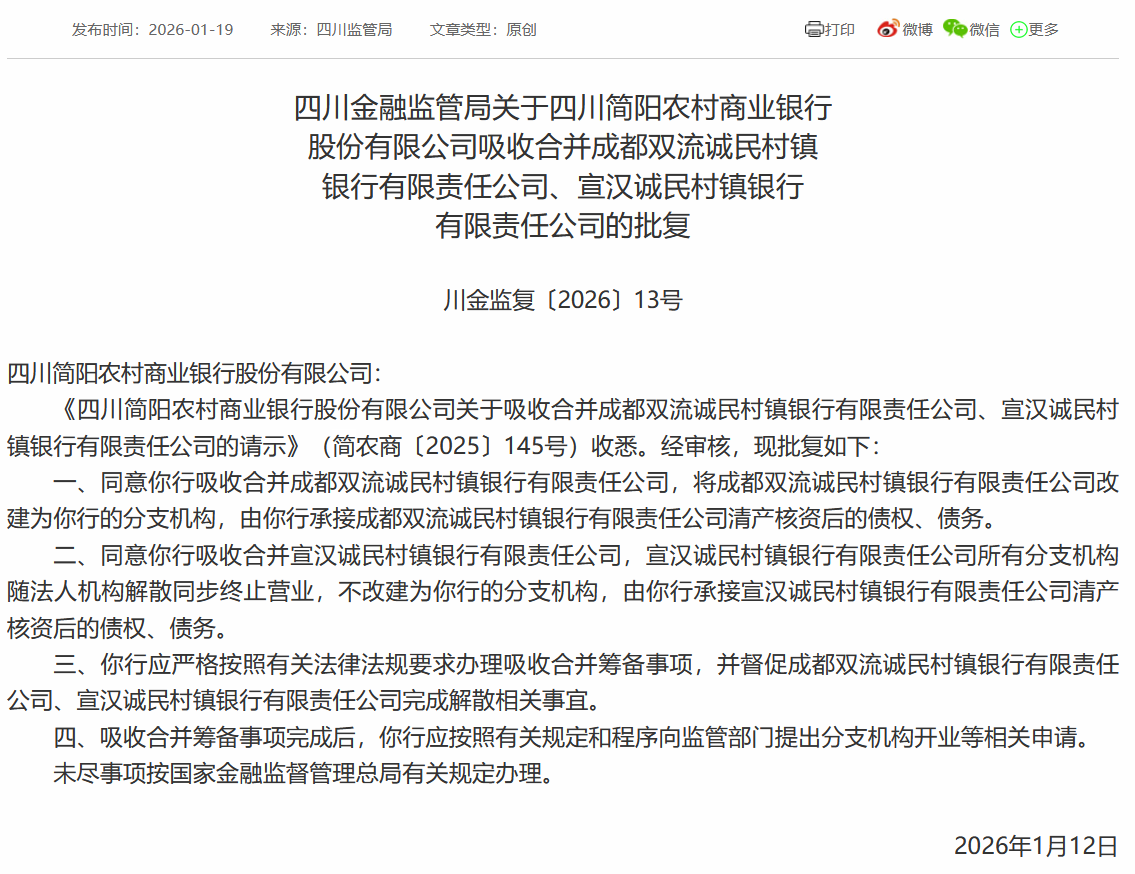 1月26日金融一线消息,四川金融监管局日前发布《关于四川简阳农村商业银行股份有限公司吸收合并成都双流诚民村镇银行有限责任公司、宣汉诚民村镇银行有限责任公司的批复》,同意简阳农商行吸收合并成都双流诚民村镇银行,将成都双流诚民村镇银行改建为该行的分支机构,并承接成都双流诚民村镇银行清产核资后的债权、债务。