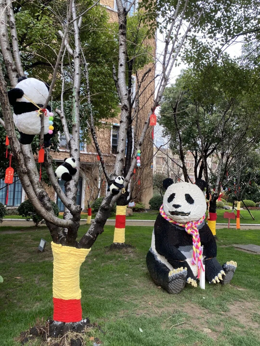 向明中学的校园树木也悄然换上了“新装”,树干缠绕着喜庆粉饰