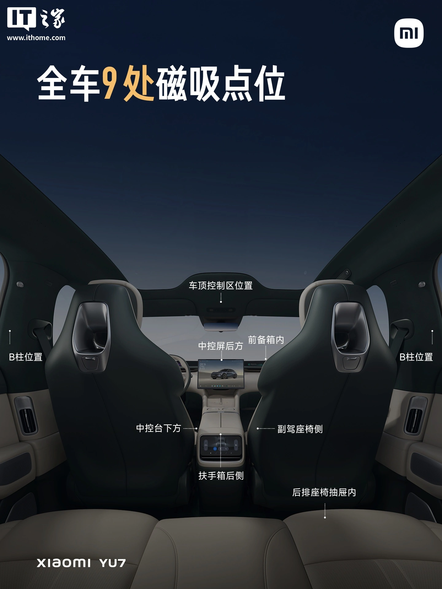 看成对比,IT之家附小米 YU7 全车 9 处荫藏式磁吸点位的具体位置如下: