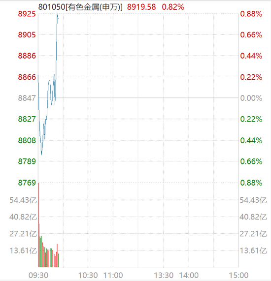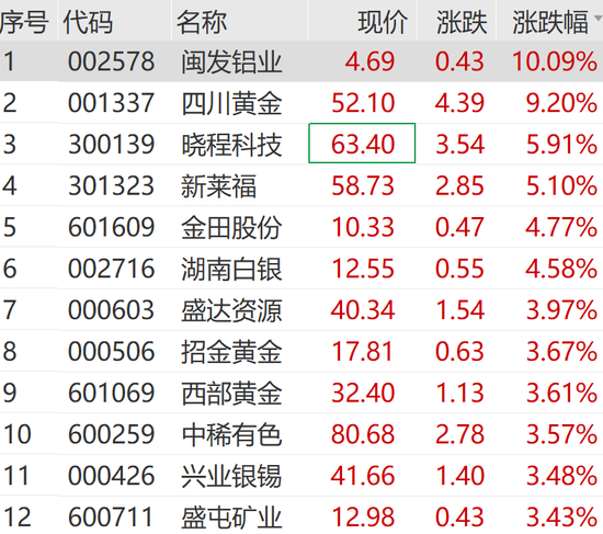 个股方面,闽发铝业涨停,四川黄金靠近涨停,金田股份、盛达资源、湖南白银等跟涨。