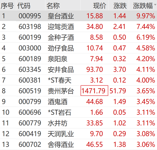 3月31日,食物饮料板块全体高开,白酒股盘初走强。皇台酒业涨停,迎驾贡酒、金种子酒、泉阳泉等跟涨,贵州茅台涨超3%。