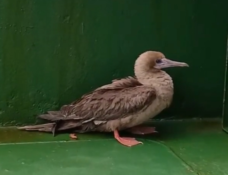 上船的红脚鲣鸟,船员默示,这只鸟“脾气”很好,被发现后,一直乖乖地在船面上的小限制内活动,似乎是第一次见到东谈主类,满眼意思。 上海海事测绘中心供图