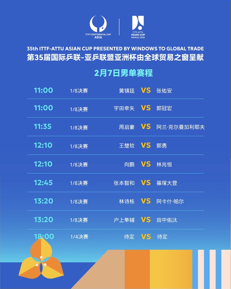 2月7日将贯穿进行男女单打1/8决赛与1/4决赛,从1/4决赛起选拔七局四胜制。