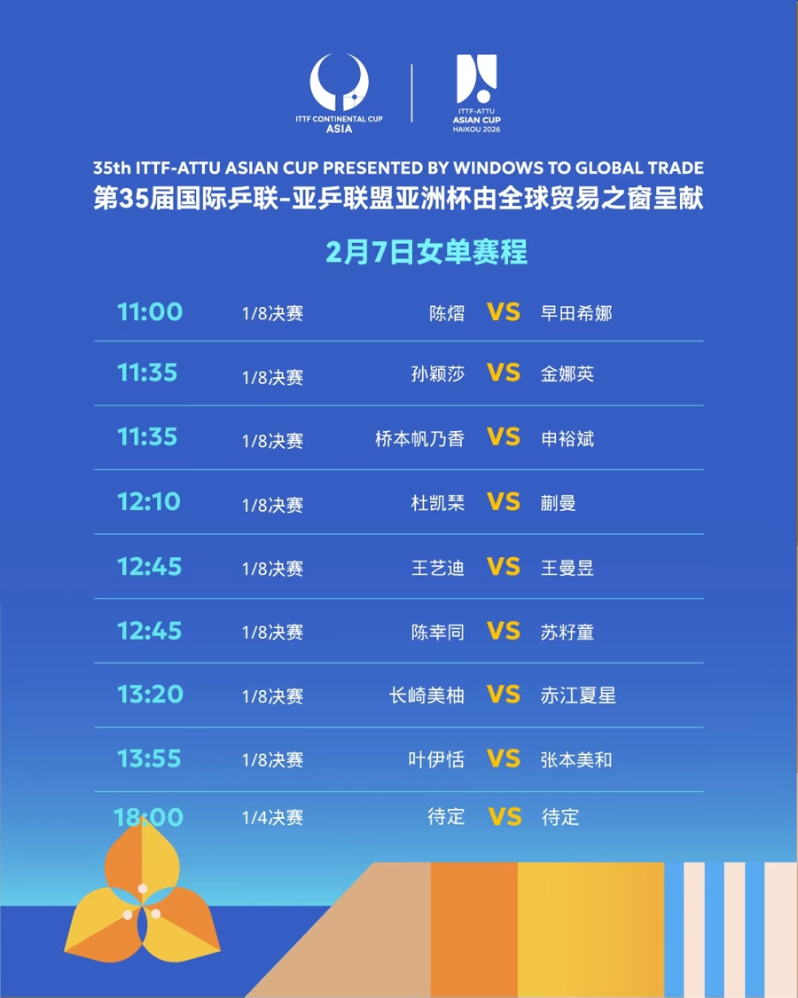 2月6日,2026年亚洲杯乒乓球赛抛弃小组赛争夺,同期进行男女单打16强对阵抽签。国乒男单4东谈主、女单6东谈主晋级淘汰赛。女单1/8决赛,王曼昱与王艺迪提前遭受成焦点。男单1/8决赛,日乒两场内战将折损两名主力。