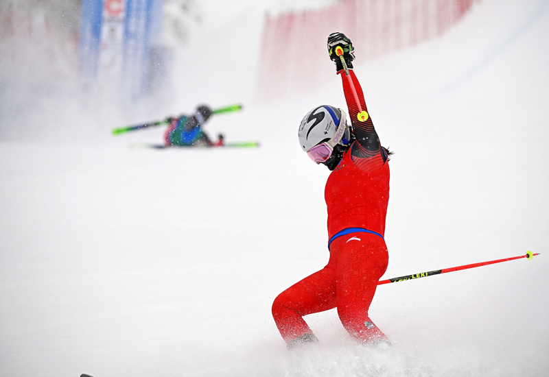 2024年2月20日,黑龙江队选手张雪莲在冲过至极后庆祝。\n 当日,第十四届寰球冬季通顺会摆脱式滑雪公开组女子阻滞追赶决赛在内蒙古乌兰察布市凉城滑雪场举行,四川队选手潘禹辰、黑龙江队选手张雪莲、云南队选手普蕊分获前三名。\n 新华社记者 赵子硕 摄