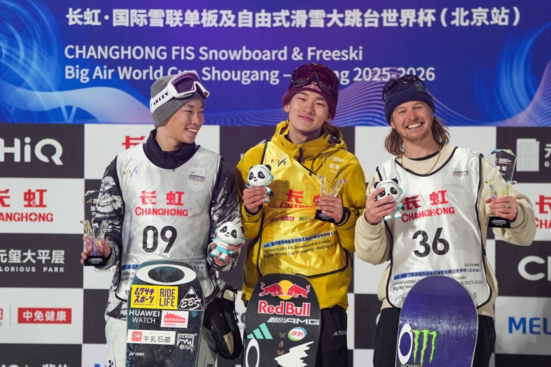 2025年12月6日,冠军中国选手苏翊鸣(中)、亚军日本选手木村葵来(左)和季军芬兰选手雷内·林内康加斯在授奖庆典上。\n 当日,2025-2026赛季海外雪联单板及摆脱式滑雪大跳台世界杯北京站单板滑雪大跳台男人组决赛在首钢滑雪大跳台举行。\n 新华社记者 鞠焕宗 摄
