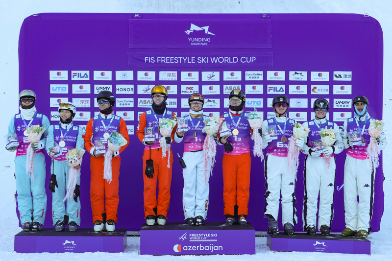 2025年12月21日,冠军中国一队(中)、亚军中国二队(左)和季军好意思国二队在授奖庆典上合影。\n 当日,海外雪联摆脱式滑雪空中妙技世界杯(云顶站)夹杂团体技俩比赛在河北省张家口市崇礼区云顶滑雪场进行。\n 新华社发