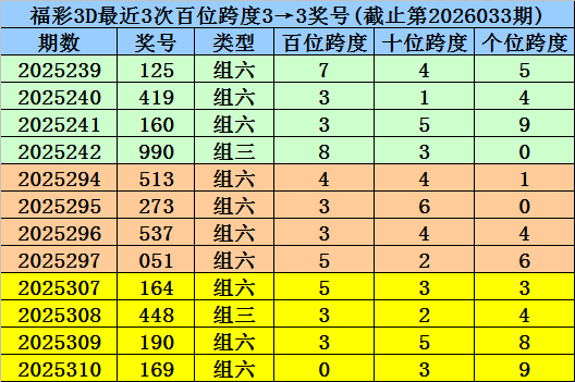 首位跨度分析:首位号码最近3期奖号为1-4-1,连续两期跨度为3、3,历史上首位号码连续两期分别开出跨度3、3的现象共出现195次,其前两次开出奖号分别为: