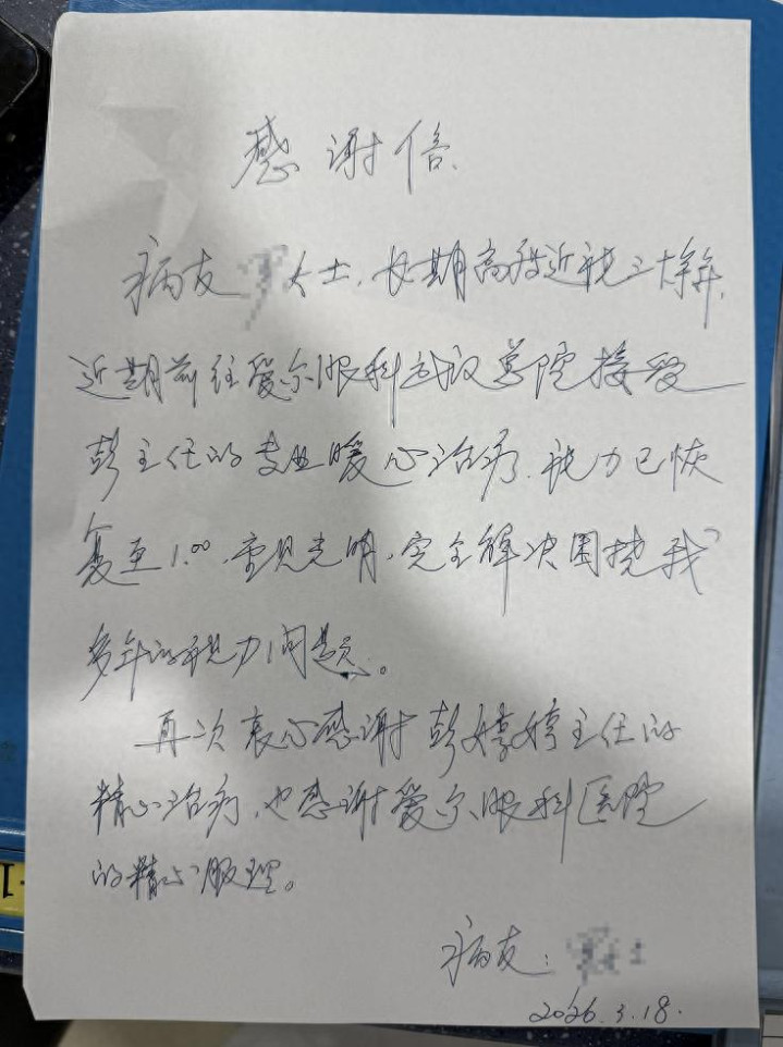 “活了泰半辈子,从来没看得这样明晰过,太感谢彭大夫了!”重获光明的孙女士欣喜万分,有益手写了一封感谢信送到彭婷婷副主任医师手中,字字句句皆透着感恩。孙女士默示,左眼手术的告捷给了她极大的信心,当今她照旧预约了右眼的白内障手术,瞻望下周完成。